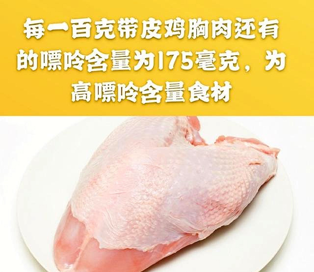 ●每100克带皮的鸡胸肉,含有的嘌呤含量为175毫克,可以说是妥妥的高嘌呤含量食材。而每100克不带皮的鸡胸肉当中所含有的嘌呤含量为137毫克左右,可以说鸡皮当中的嘌呤含量是比较多的。