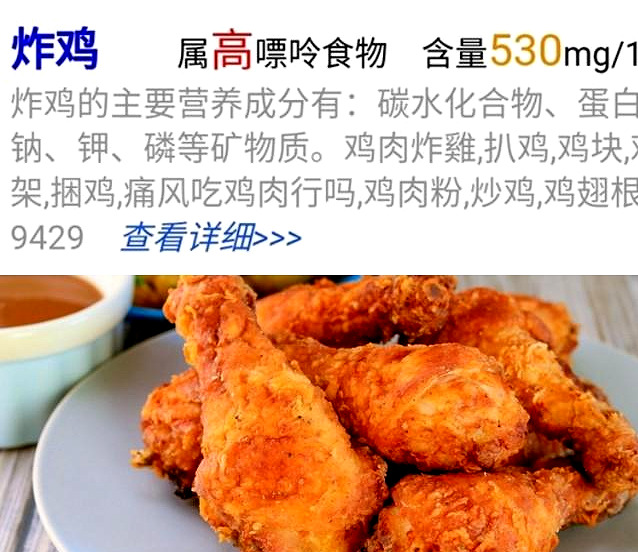 另外油炸的烹饪方法对于尿酸异常的人群来讲切勿选择,虽然油炸以后的鸡肉确实非常的美味,但是鸡肉经过油炸以后嘌呤会有一个爆炸性的增长,每100克的炸鸡当中含有的嘌呤高达530毫克,无异于是一个嘌呤炸弹。