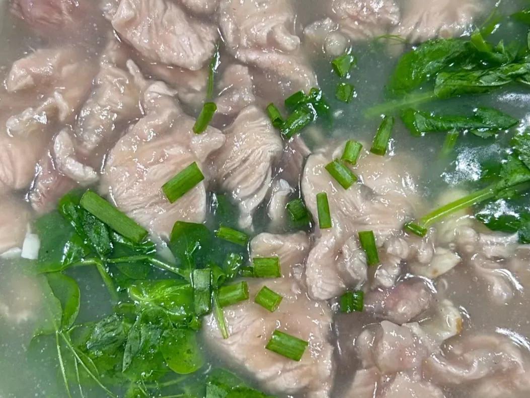 准备食材: 瘦肉、豌豆尖、姜丝、葱花。