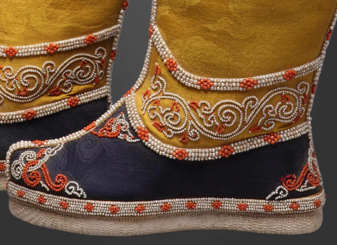 此靴以丝缎为面,使用了大量金线、米珠和珊瑚等材料作装饰花纹,其舒适性和装饰性都较清入关前之靴大为提高。