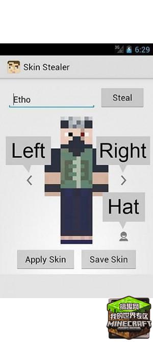 《Minecraft皮肤偷取器 Skin Stealer for Minecraft》可以帮助你把别人好看的皮肤都扒下来,并且应用到自己的MC角色中去。输入别人的用户名,就能查看别人的皮肤,并点击应用和保存即可偷取。比如输入Etho,看到这位用户的卡卡西衣服没有,扒下来吧。皮肤可以应用到PC端的MC和手机端的PE版。