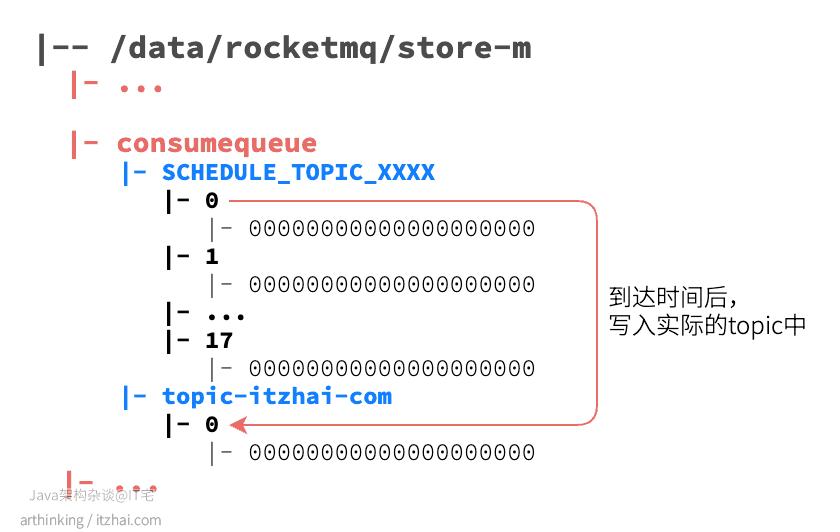 定时消费是指消息发送到Broker之后不会立即被消费,而是等待特定的时间之后才投递到Topic中。定时消息会暂存在名为SCHEDULE_TOPIC_XXXX的topic中,并根据delayTimeLevel存入特定的queue,queueId=delayTimeLevel-1,一个queue只存相同延迟的消息,保证具有相同延迟的消息能够顺序消费。比如,我们设置1秒后把消息投递到topic-itzhai-comtopic,则存储的文件目录如下所示: