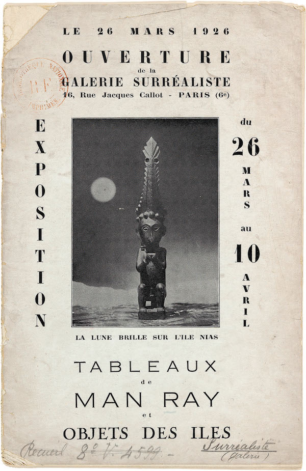 1926年,超现实主义画廊在巴黎落成。在题为“岛屿之物”的开幕展上,异域物品与曼·雷(Man Ray)的作品被并置一处。曼·雷的一幅摄影被赫然印在展览图录的封首。据艺术家本人介绍,这幅作品展现了大洋洲尼亚斯岛(Nias)上的一个月圆之夜,画面前景中是本次展览上的一件展品——来自尼亚斯岛的土著雕像。詹姆斯·克里福德(James Clifford)48用“人种学超现实主义”一词准确概括出了超现实主义文艺思潮的特点。与民族学研究不同,这场超现实主义美术展是一种以面具和稀有“物品”为对象的宗教祭祀,物品的阐释权归文学家所有。在这里,时代及来源方面的一切差异都被取消,因为这些“物品”完全是“超现实的”,很难像以往那样加以准确归类。与此同时,对面具的阐释也发生了逆转,正如克里福德对超现实主义运动所做的描绘,人们不假思索地“将面具与色情、异域和无意识联系在一起”。