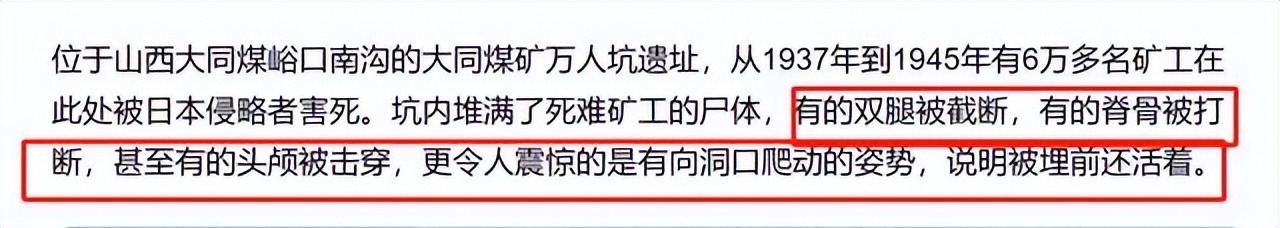 当年日本为了从大同掠夺煤矿资源,从全国各地抓捕大量劳工运往大同,推行“以人换煤”的血腥策略,劳工在暗无天日的地下没日没夜的挖坑,稍有懈怠就被残忍杀害,随便找个坑就丢了进去。