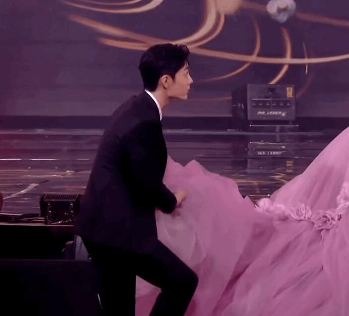 第一次是杨紫要去后台换装的时候,肖战看着她的大裙摆快要挂到座位上面,想要去提一下,但是失败了提了个寂寞。第二次是肖战和杨紫一起上台领微博king和微博queen的时候,这一次肖战终于发挥暖男本色提到了杨紫的裙子。