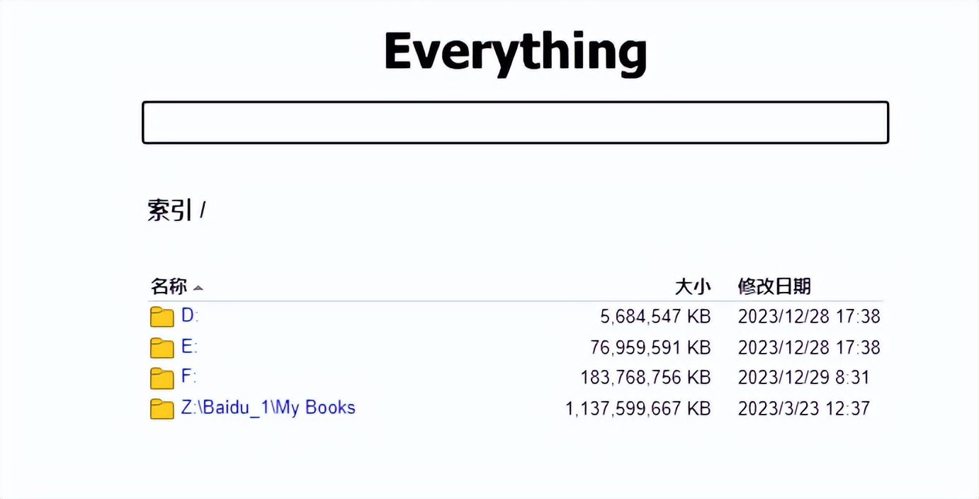 然后打开浏览器,输入localhost,或 http://127.0.0.1 ,输入用户名和密码,即可来到Everything的目录页,列有你共享出的硬盘,点击进入相应目录即可下载。