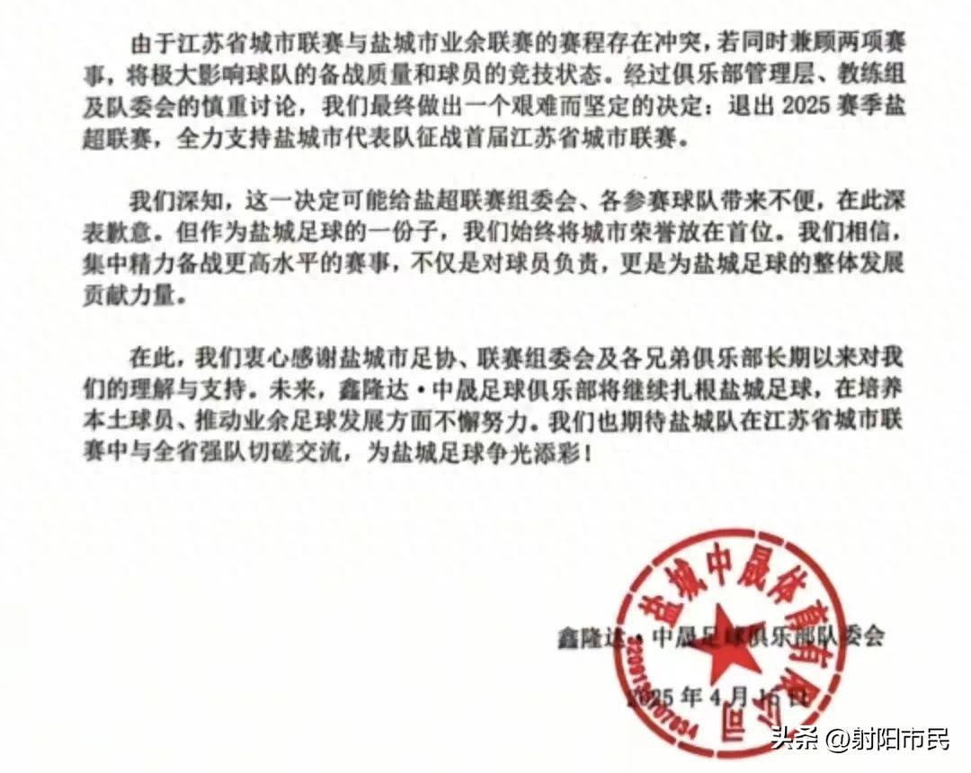近期,盐城一足球俱乐部全力支持!盐城市代表队征战首届江苏省城市联赛。内容如下:由于江苏省城市联赛与盐城市业余联赛的赛程存在冲突,若同时兼顾两项赛事,将极大影响球队的备战质量和球员的竞技状态。经过俱乐部管理层、教练组及队委会的慎重讨论,我们最终做出一个艰难而坚定的决定:退出2025赛季盐超联赛,全力支持盐城市代表队征战首届江苏省城市联赛。我们深知,这一决定可能给盐超联赛组委会、各参赛球队带来不便,在此深表歉意。但作为盐城足球的一份子,我们始终将城市荣誉放在首位。我们相信,集中精力备战更高水平的赛事,不仅是对球员负责,更是为盐城足球的整体发展贡献力量.在此,我们衷心感谢盐城市足协、联赛组委会及各兄弟俱乐部长期以来对我们的理解与支持。未来,鑫隆达·中晟足球俱乐部将继续扎根盐城足球,在培养本土球员、推动业余足球发展方面不懈努力。我们也期待盐城队在江苏省城市联赛中与全省强队切磋交流,为盐城足球争光添彩!
