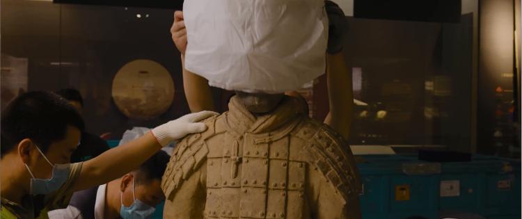 工作人员在现场对兵马俑展品进行开箱和拆除包装