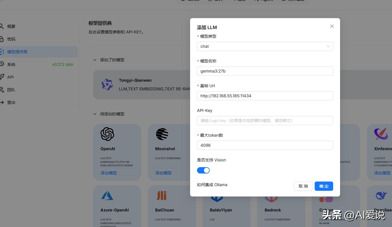 如图,点击模型供应商,在下面找到ollama,ollama部署gemma3和deepseek在之前的文章都有介绍。查看模型名称,填入如图的框中。