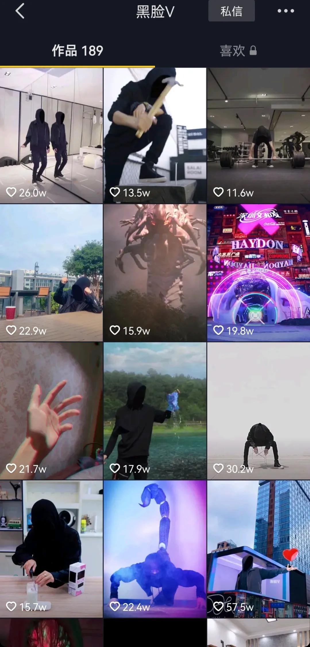 因为拍的视频都是黑色特效遮脸,这个特点让他在在一众露脸的抖音视频中脱颖而出。