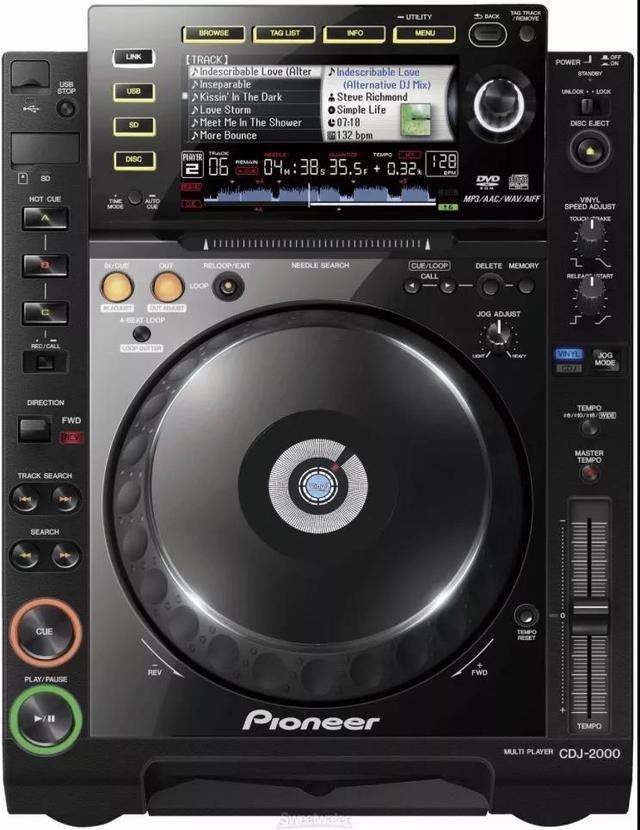 CDJ是一种电子唱机,它是由传统的机械唱机(Turntable)进化而来的,现代的电子唱机都已经数字化了,已经不需要真的将碟片放上唱机来读取音乐了,只要将U盘插入碟机或者连接电脑即可读取音乐,当然,它也保留了可以插碟片的功能,而配备液晶显示功能的CDJ更可以通过显示屏进行各种操作设置,也可以直接显示歌曲的波形。除此之外,CDJ也有很多音效设置功能,甚至可以增加打击垫。它的功能十分强大,当然价格也不菲。它中间的圆盘其实是在模拟传统唱机的唱盘,通过转动唱盘可以控制让歌曲播放更快或更慢,这一项操作主要是给DJ进行歌曲对拍或者进行挫碟(Scratch)时使用。而Player的另一大功能就是调节播放歌曲的速度(Tempo),现在的CDJ已经可以做到自动识别歌曲BPM甚至SYNC键一键对速。