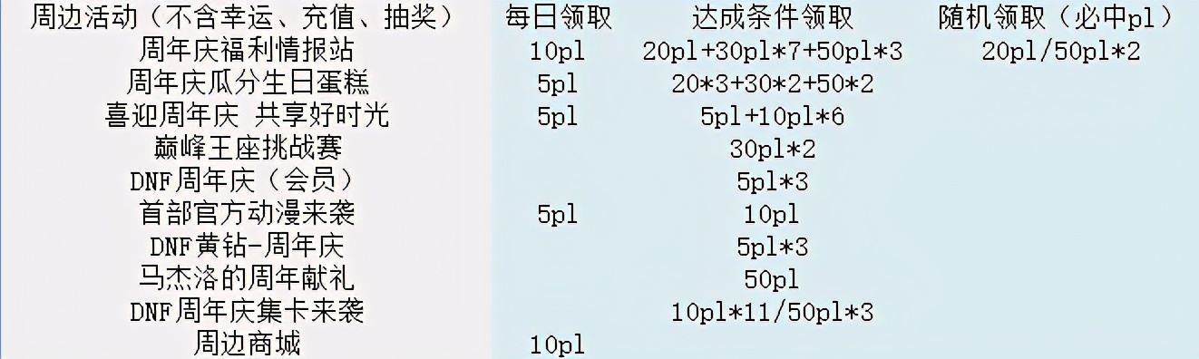 迎冒险家回归 多重好礼大派送(156pl+14x30pl):每位在周年庆期间回归的小伙伴们,都可获得内含156pl药的回归冒险家欢迎礼盒。同时,还可每日通关10次推荐地下城(深渊和每日3+3 2+2 4等都算)领取内含30pl药的回归冒险家任务达成礼盒,共可完成14天。