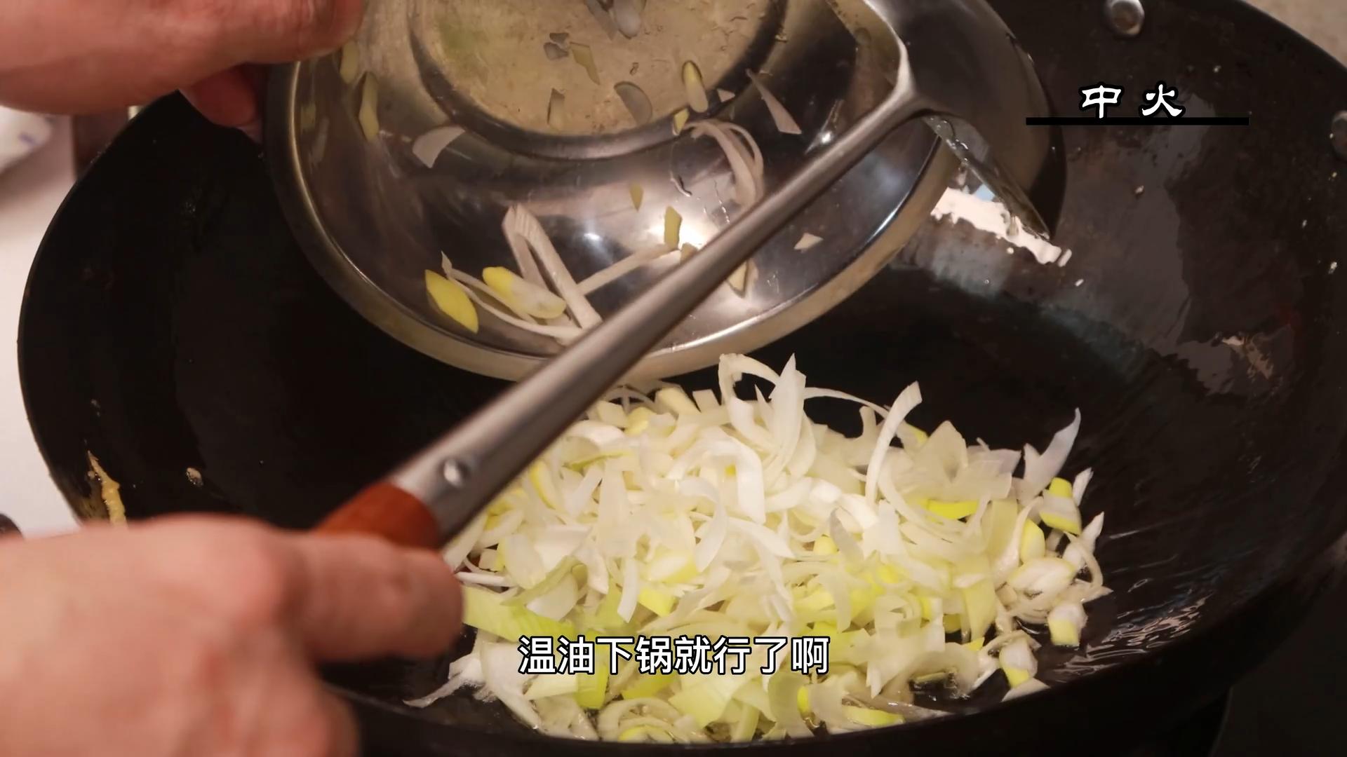 6、大葱煸炒到焦黄,散发出浓郁的葱香味就可以了,不要炒焦。