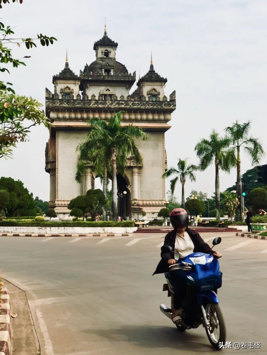 这张照片拍自于老挝首都万象,在万象的凯旋门前面,我想拍摄一张有人文气息的照片,想抓拍一个骑车的人经过的瞬间,上面的照片就是最终的效果。