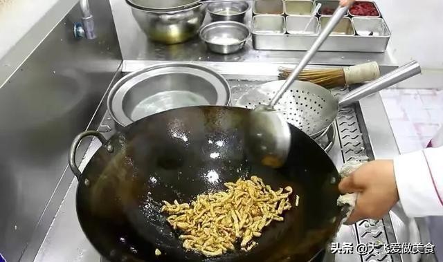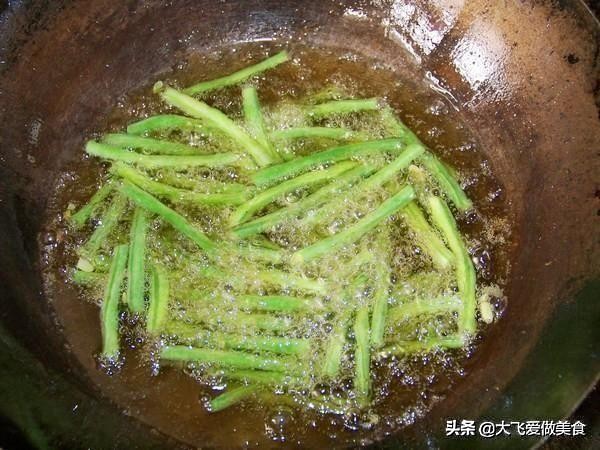 大飞有话说:要是爆一点肥肉油在长豆角里会更香的了。热锅凉油的原理,肉丝遇到锅底的热量产生向上的推力,缓冲的一瞬间,使肉丝舒展伸开,充分滑油,受热均匀。起到了不粘锅作用。
