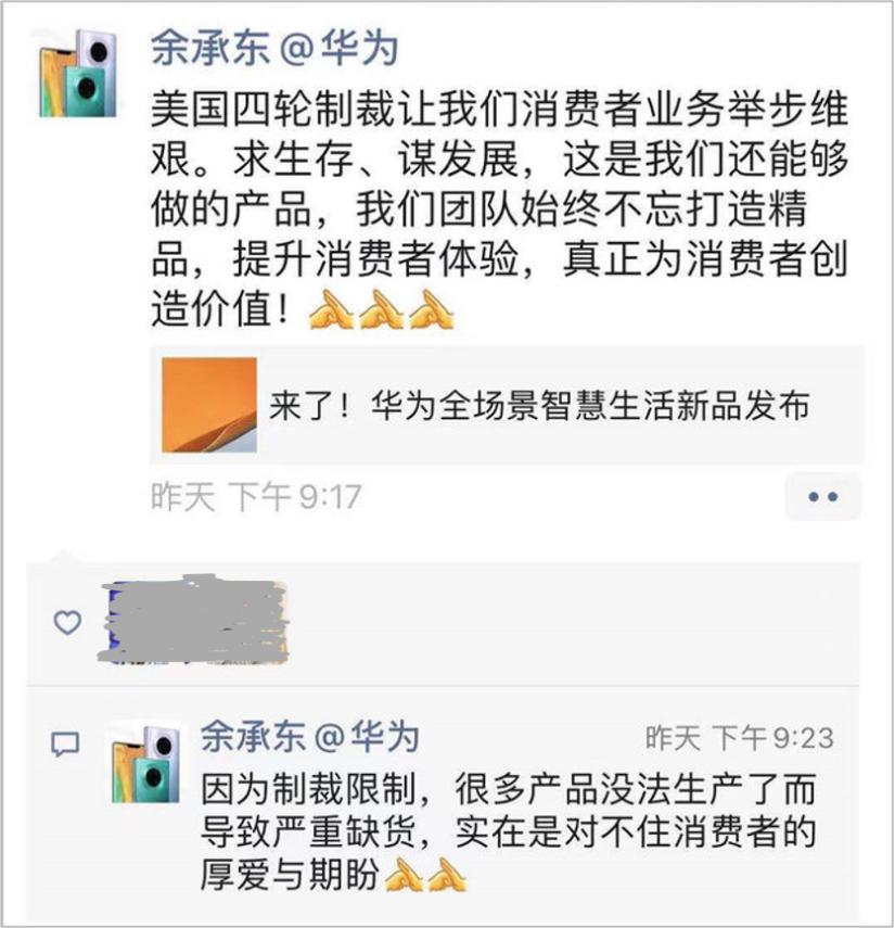 在朋友圈,余承东落寞的写下:“因为制裁限制,很多产品没法生产了而导致严重缺货,实在是对不住消费者的厚爱与期盼。”