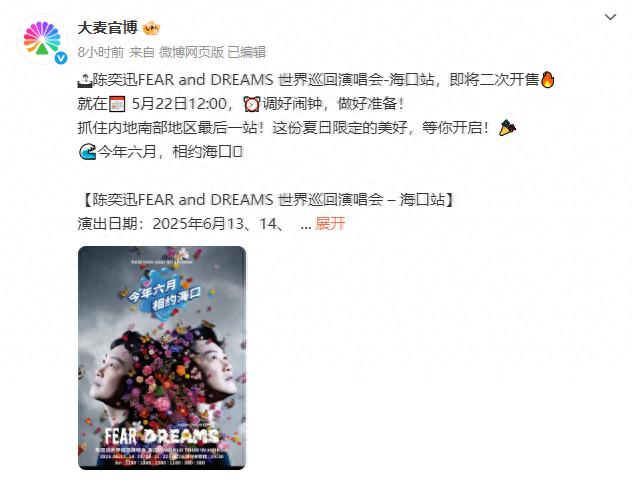 5月20日13时14分,@大麦官博宣布,5月22日12点,陈奕迅FEAR and DREAMS 世界巡回演唱会-海口站,即将二次开售。