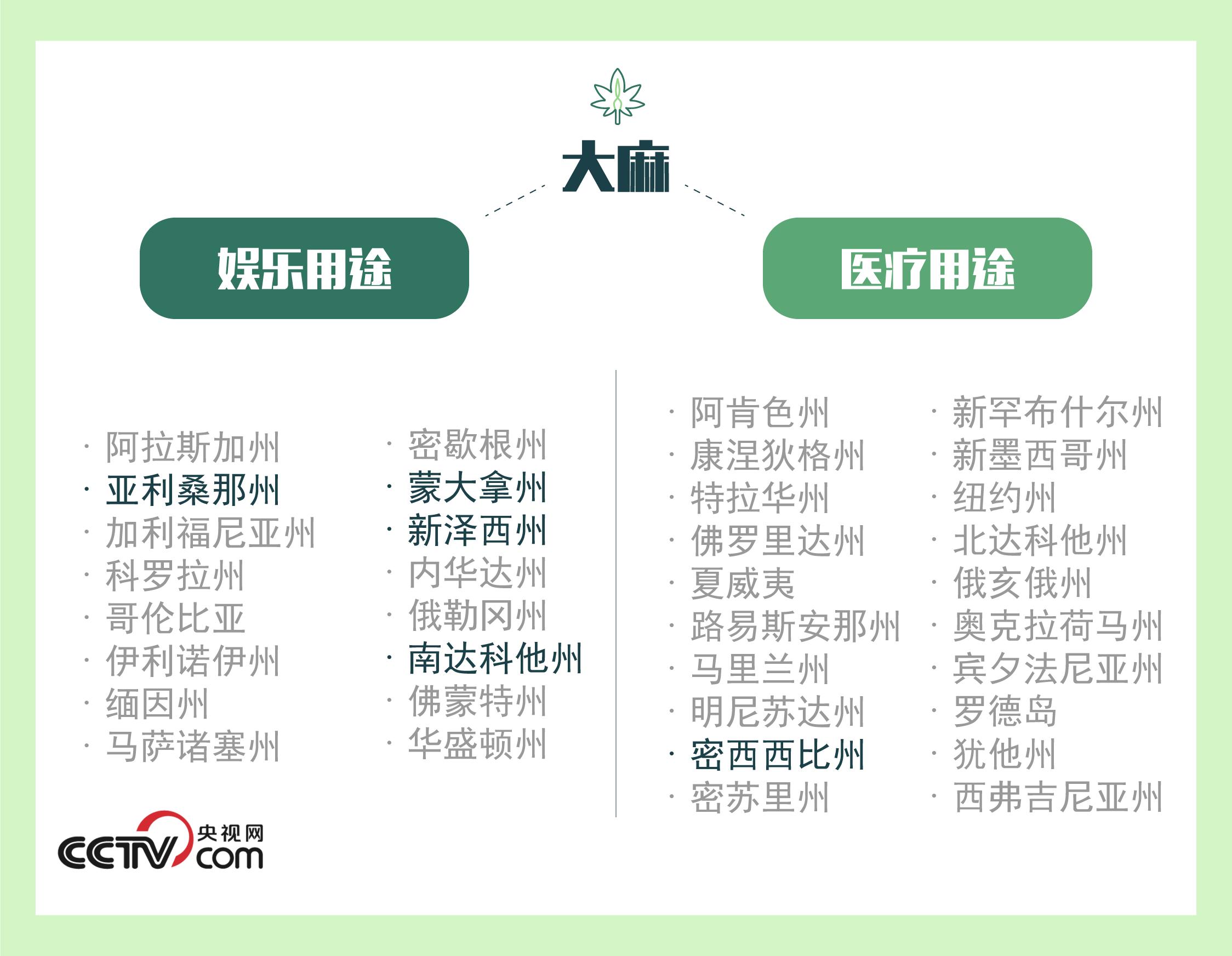 大麻的医疗用途和娱乐用途的合法性因国家而异。据统计,截至2020年11月12日,美国共有15个州(外加华盛顿哥伦比亚特区)将少量大麻合法用于娱乐,20个州仅将其合法用于医疗。