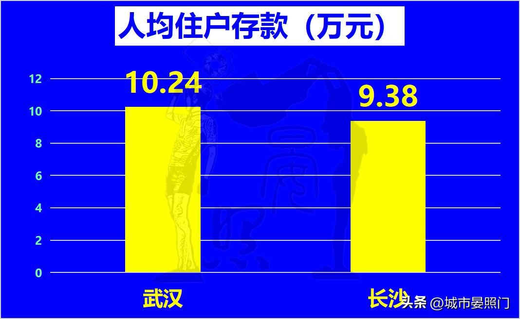 即便是在最能代表一座城市居民财富值的人均住户存款方面,长沙依旧是未能上演逆袭好戏。不过,虽然武汉人均存款顺利突破十万大关,但在面对长沙时,领先优势依旧未能破十,仅有9%。这也导致武汉在象征经济质量的人均经济指标上,没有一项能够以超10%的优势胜出,而且在人均收入上还落后于长沙8%。由此可见,长沙和武汉在经济发达和富裕维度上,其实已经完全处于同一水平。