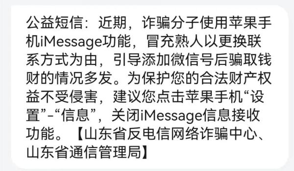 近期,诈骗分子使用苹果手机iMessage功能,冒充熟人以更换联系方式为由,引导添加微信号后骗取钱财的情况多发。为保护您的合法财产权益不受侵害,建议您点击苹果手机“设置”-“信息”,关闭iMessage信息接收功能。