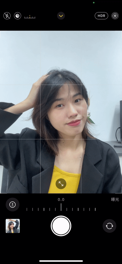 我们返回拍照界面,打开前置镜头,可以发现脸部的锐化情况没有特别严重了。点击上方的箭头,找到「曝光」,向左滑动+0.7左右,增加美白效果。