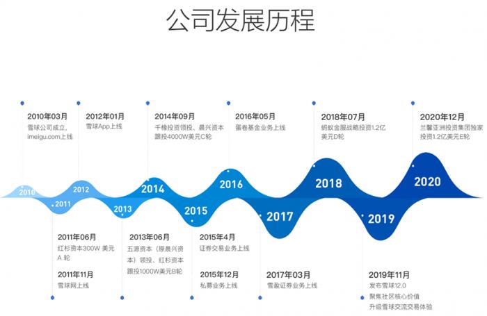 2010年,公司成立当年获得由明势资本和知名投资人薛蛮子旗下蛮子基金投资的数百万元天使轮融资。薛蛮子投资后不到一年,沈南鹏的红杉资本2011年6月独领雪球A轮融资,投资2000万元。
