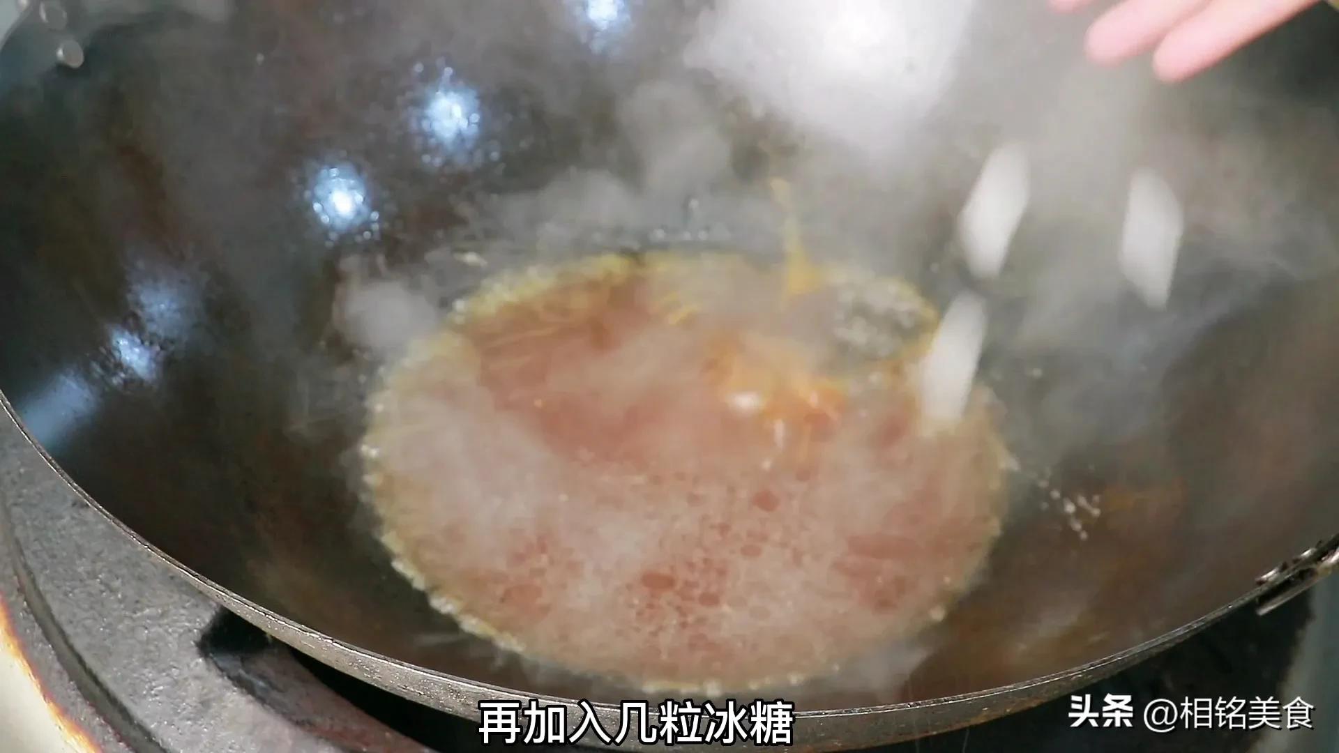 锅里放油,下入冰糖炒糖色,颜色刚变枣红色的时候,下入葱姜激发出香味,然后香料下锅,炒出香味以后往锅里加水;