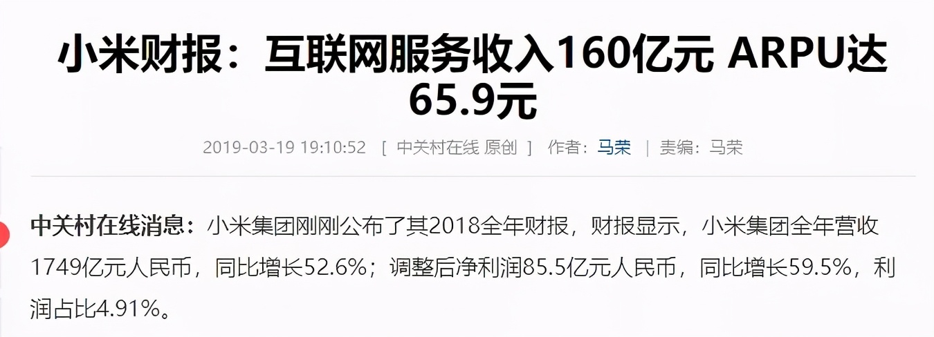 2018年小米互联网服务收入160亿元人民币,同比增长61.2%,总营收是1749亿。2019年小米互联网服务收入达到198亿元,同比增长24.4%,总营收是2058亿。