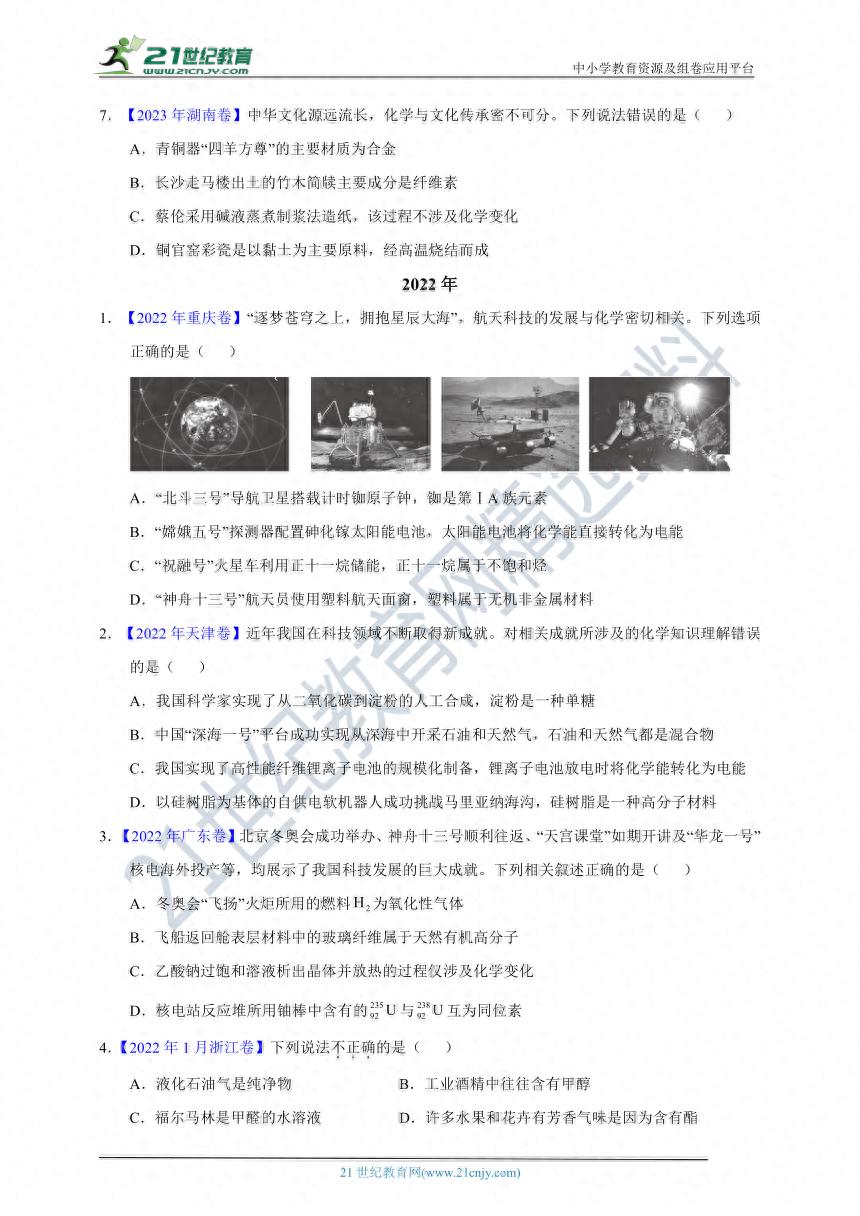 资料预览:2023-2021三年高考化学真题分类汇编 专题一 化学与STSE(原卷版) .doc