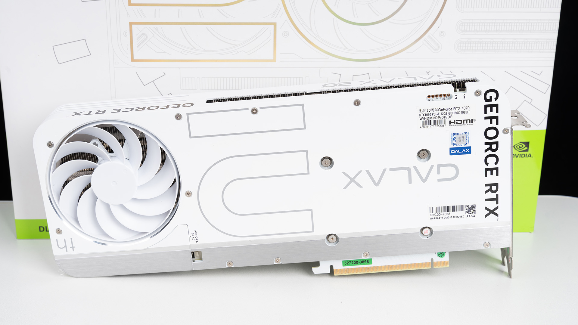 影驰RTX 4070 20周年纪念版还可以搭配附赠的ARGB显卡支撑架使用,通电后能展现GALAX LOGO,不过挡住显卡本身的侧面RGB灯效。
