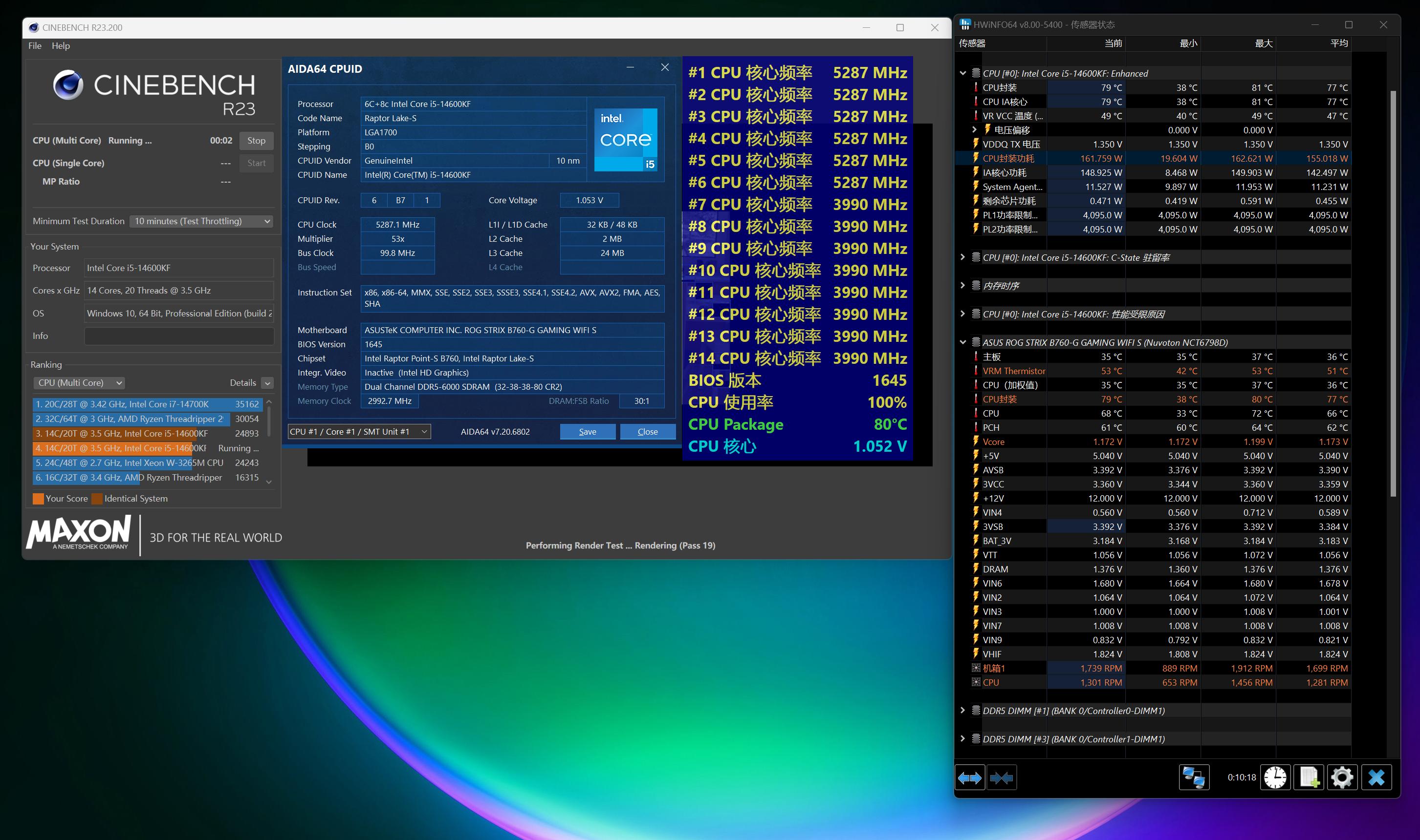 降压后,运行CINEBENCH R23多核循环烤机也很稳定,十分钟过去大核稳定5.3GHz,小核稳定4.0GHz,温度从100℃降到了79℃,CPU封装功耗只有160W,效果相当显著,同时能留意到机箱转速也降了一些,也就是噪声相对小点。