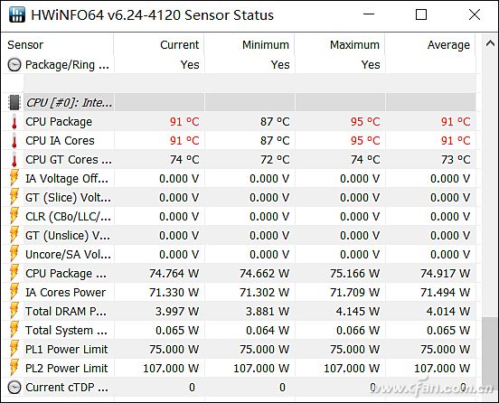 在AIDA64和FurMark双烤测试下,前15分钟左右拯救者Y7000P处理器依旧可以保持75WTDP的输出状态,但当CPU温度达到95度便会触发降频机制,此时处理器功耗会降到45W左右,主频维持在3.1GHz左右。