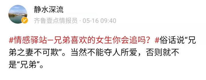 【参与方式】下载齐鲁晚报官方客户端――齐鲁壹点,在情报站点击话题#情感驿站—兄弟喜欢的女生你会追吗?#+文字/图片/短视频/音频上传即可。