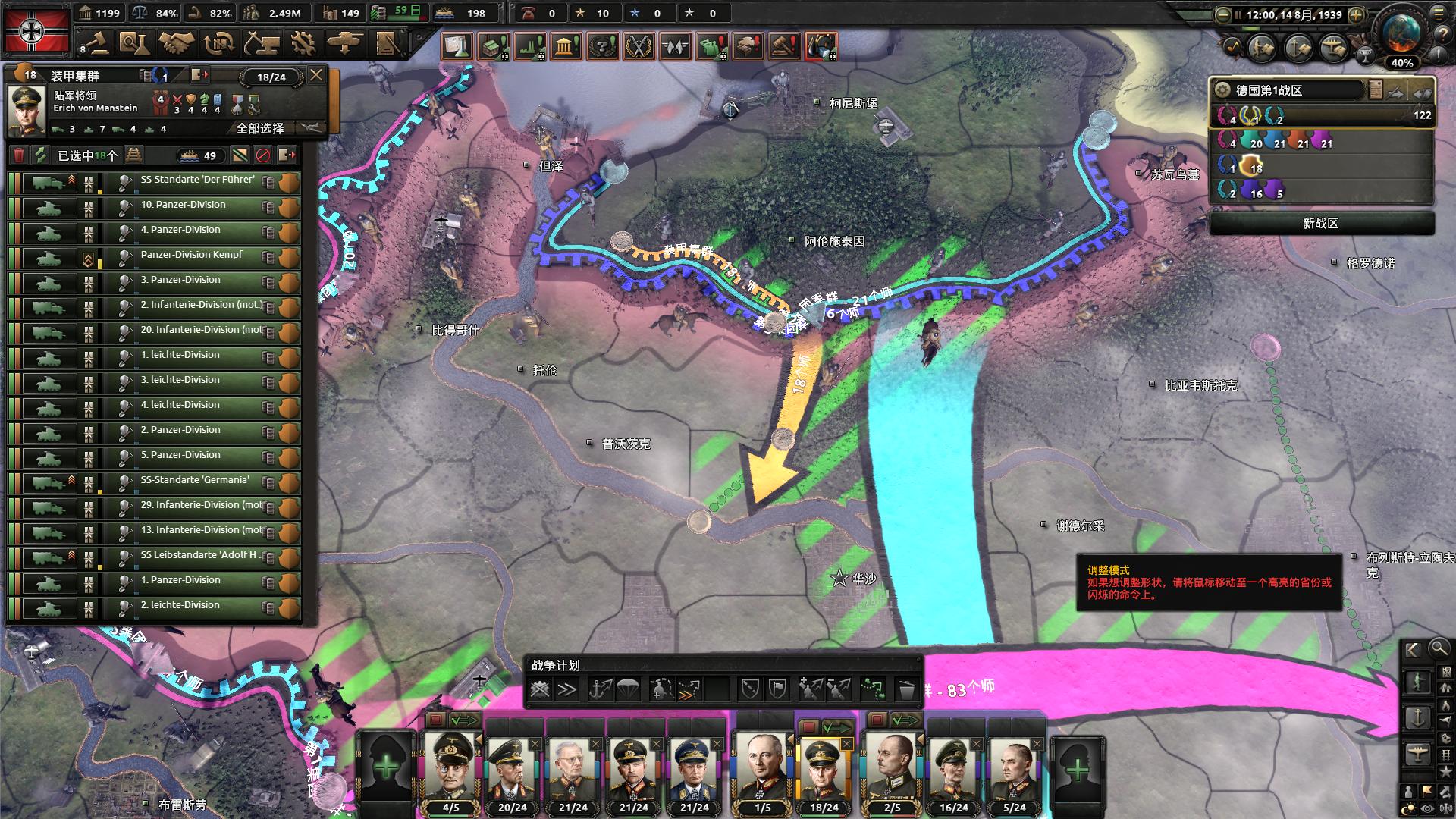 将其余步兵师、山地师、伞兵师稍稍整理一下,西线法国边境安排两个集团军驻守,其余的全部驻扎在德波边境以及瓦尔米亚地区,并给各个集团军划上进攻线。