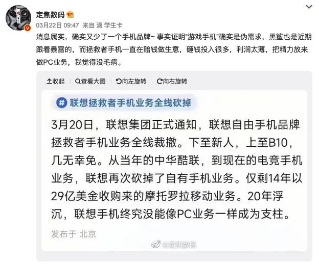 而2023年3月,有传闻指联想旗下的拯救者手机业务全线裁撤,下至新人,上至B10「几无幸免」,目前无论联想还是拯救者手机方面均未对传闻作出回应。我们查看了其官方微博「拯救者电竞手机平板」,最新的内容还是今年3月拯救者Y900平板电脑的,手机相关的博文最新也停留在今年1月的。