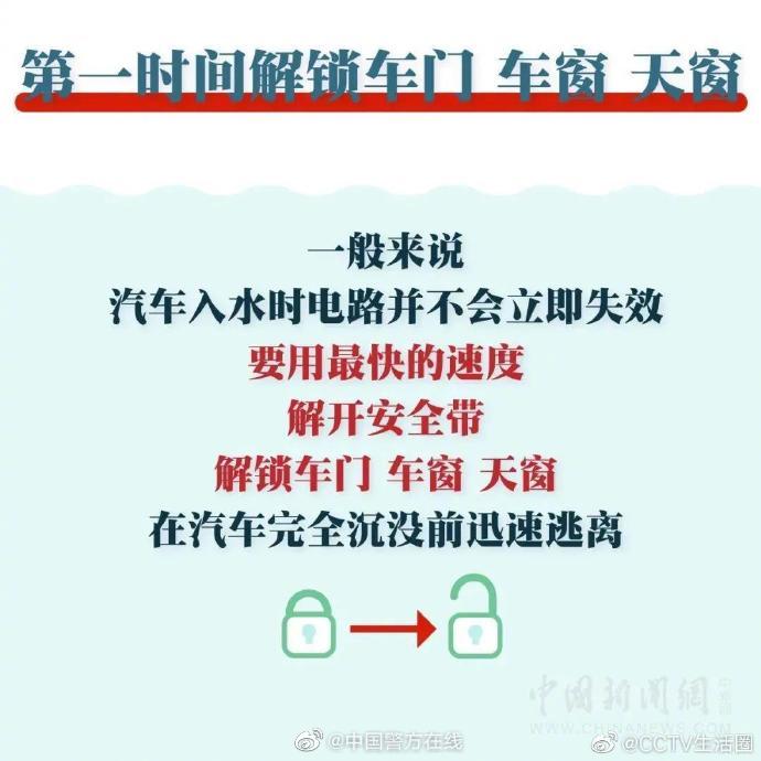 【车辆落水如何自救这份指南请收下!】你身边的安全提示汽车落水时,①应迅速辨明所处位置,确定逃生方案②两三分钟车辆就会浸入水中,不要打电话,抓紧时间自救③尽量从车后座逃生④若车门车窗无法打开,可从后备箱逃生⑤砸侧窗玻璃,而非挡风玻璃……