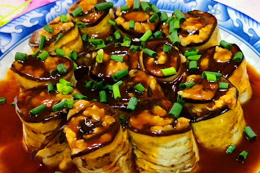 4.玉米蓉肉馅腌制入味后取出,再取出之前切好的茄子片,先将茄子片铺平到案板上,再挖一勺玉米蓉肉馅铺到茄子片上,然后将茄子片从较窄一头卷起来,要卷得紧实一点,防止散花。卷好后竖着、一个挤一个摆入盘子中间。接着再放入蒸锅中蒸,大火烧开后再继续蒸15分钟就差不多熟了。