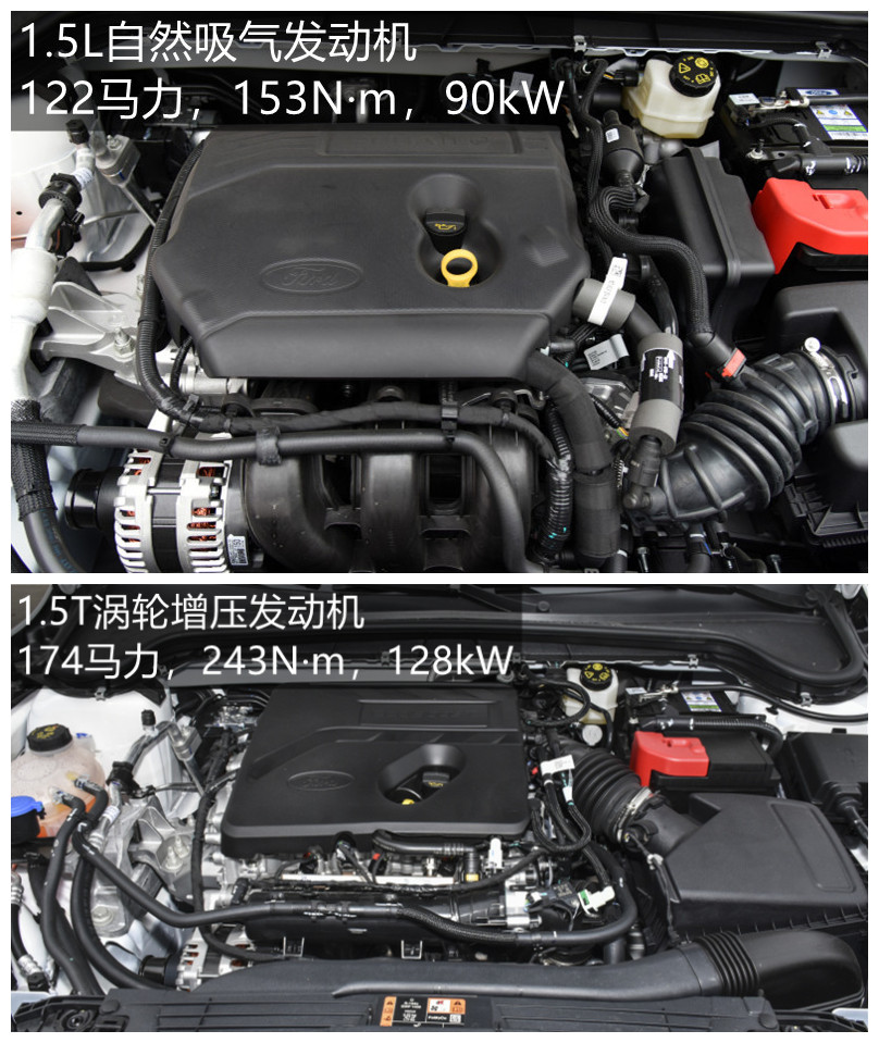 福克斯一共使用了三套动力总成,分别是1.5L+6MT,1.5L+6AT,1.5T+8AT,其中1.5L是自然吸气直列三缸发动机, 马力122 Ps,最大功率90kW,最大扭矩153N·m,喷油方式是多点电喷,1.5T是涡轮增压直列三缸发动机,马力174Ps,最大功率128KW,最大扭矩243N·m,喷油方式混合喷射,从数据来看表现还行,且百公里加速最快可达8.9秒。