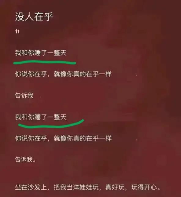 还有就是下面划线的句子的意思,是否有争议?或许你说我想的太丰富、不健康,你说的是字面意思,是纯洁的。可是既然有这个意思,那就不能排除,一千个人眼中,有一千个哈姆雷特。所以为了谨慎起见,为了对粉丝负责任,你还是把歌词改了,把内涵丰富性些,注重精神引领,你说呢?否则,这样的歌词让粉丝唱出来,你忍心吗?