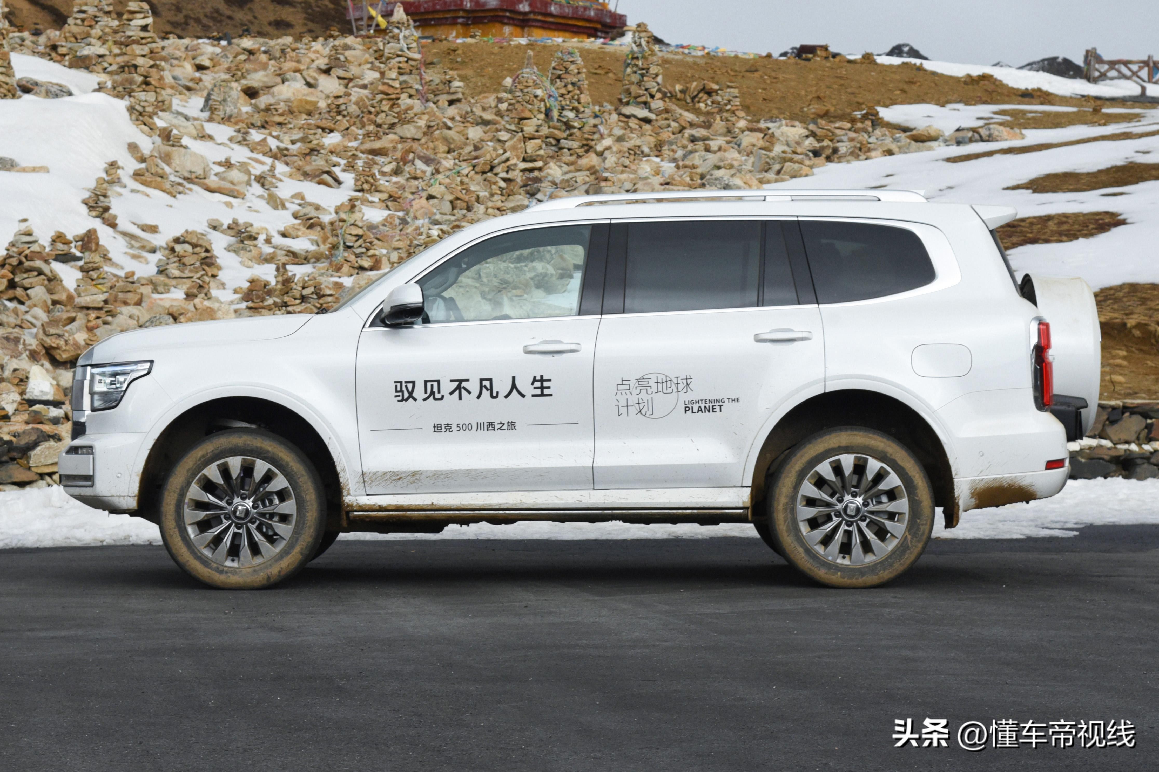此次我们试驾的道路大多在海拔3500米以上的高原地区,这样的海拔高度对于常年生活在平原地区的成年人来说,轻轻跑几步也要喘几口粗气。我们试驾的坦克500整备质量已经接近2.5吨,所以想让它在氧气稀薄的高原上行驶更是对发动机的考验,好在它全系3.0T起步,从平原场景切换到高原场景,并不会让人感觉出坦克500的动力会有衰减现象,这也是很多小排量发动机难以达到的水平。