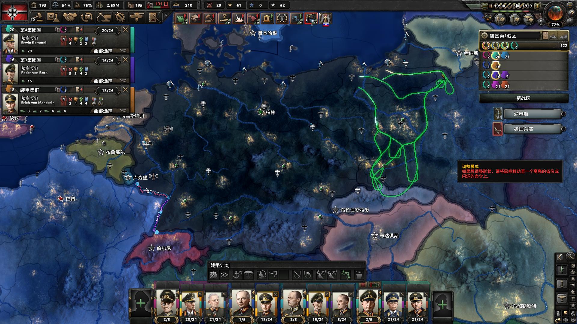 将其余步兵师、山地师、伞兵师稍稍整理一下,西线法国边境安排两个集团军驻守,其余的全部驻扎在德波边境以及瓦尔米亚地区,并给各个集团军划上进攻线。