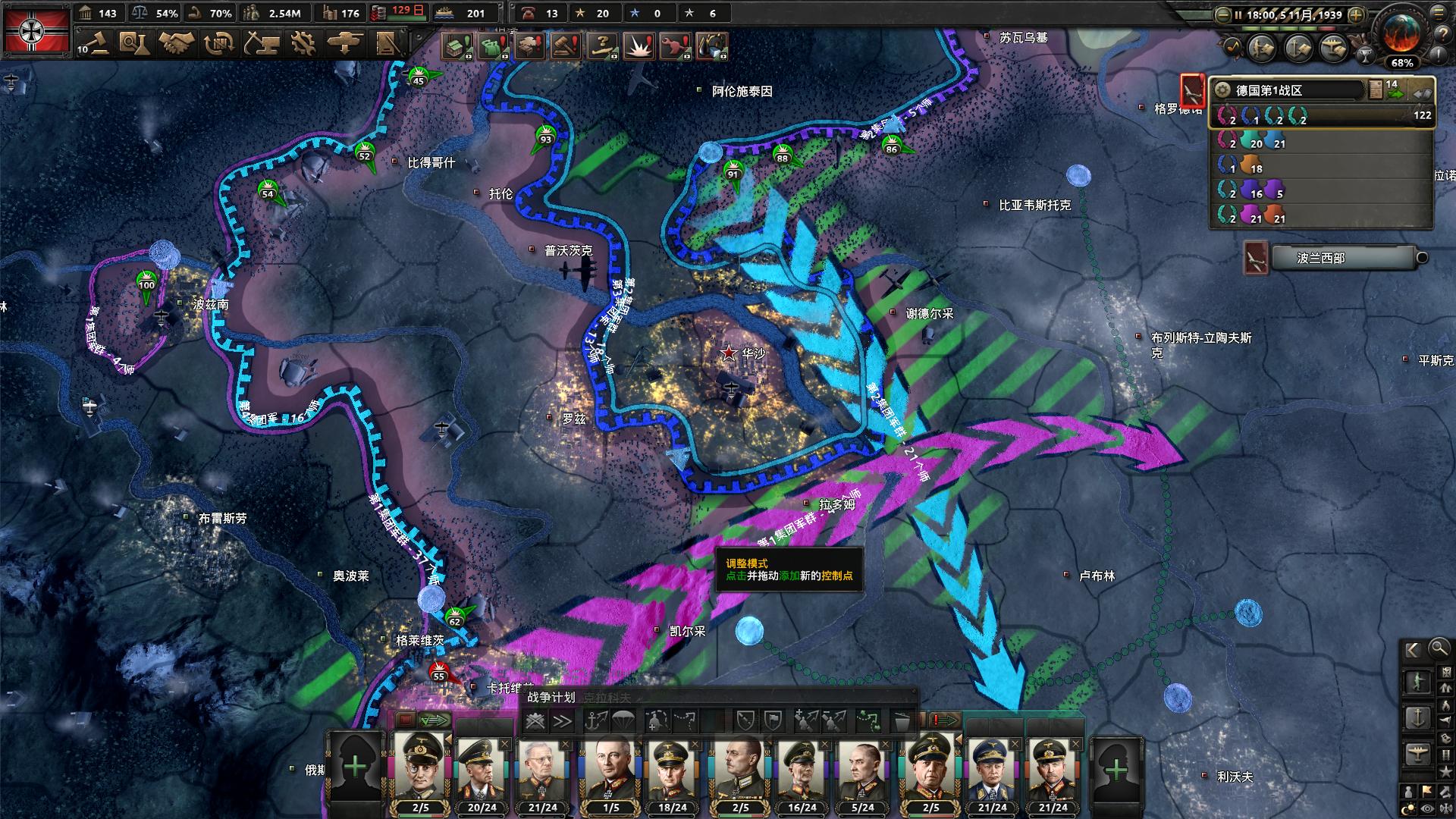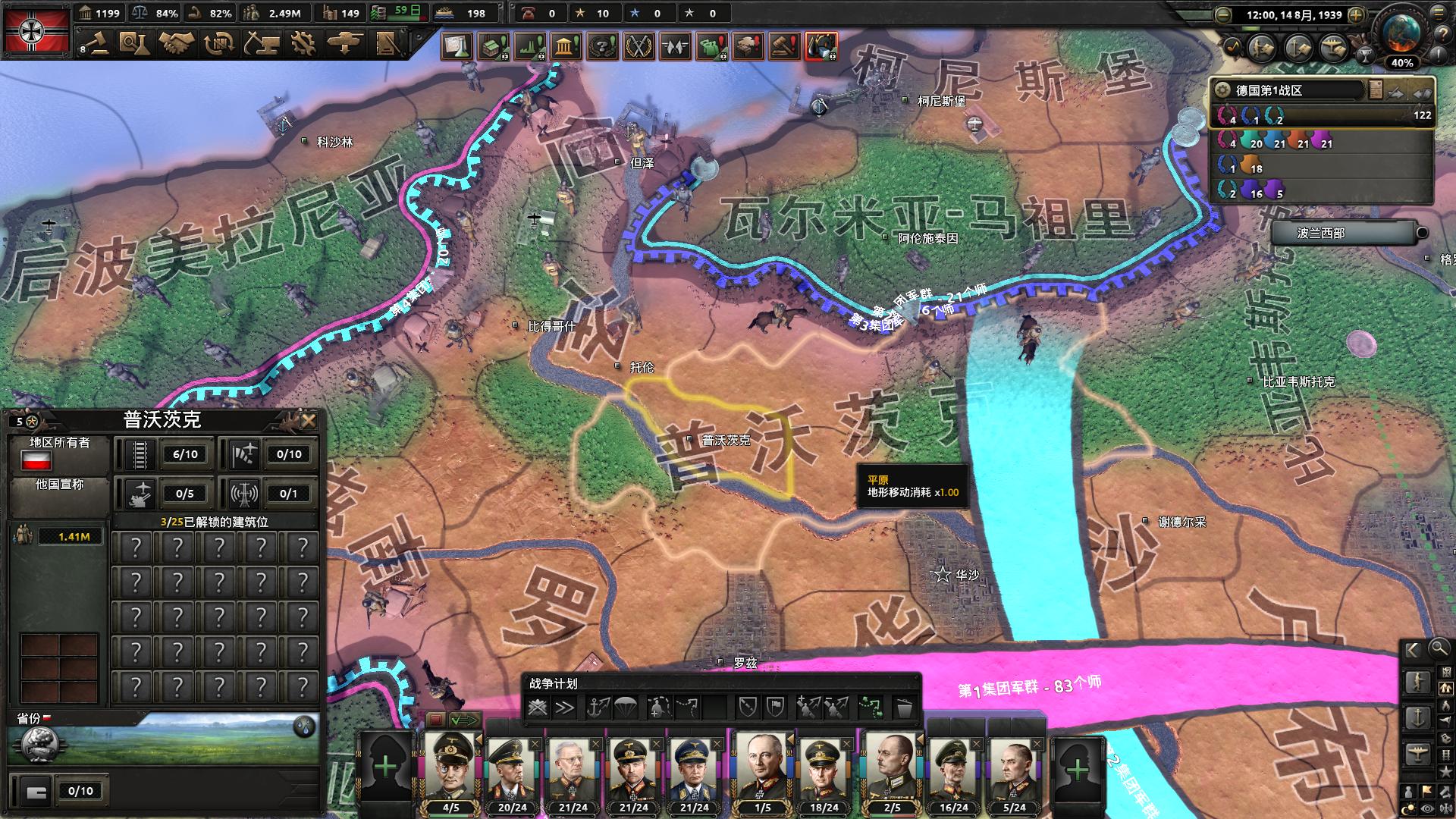 闪击波兰实际上没有什么好说的,唯一的要点就是安排一些部队守住德法边境,东线战场怎么打都没有问题,甚至完全靠部队平推都是可以的。