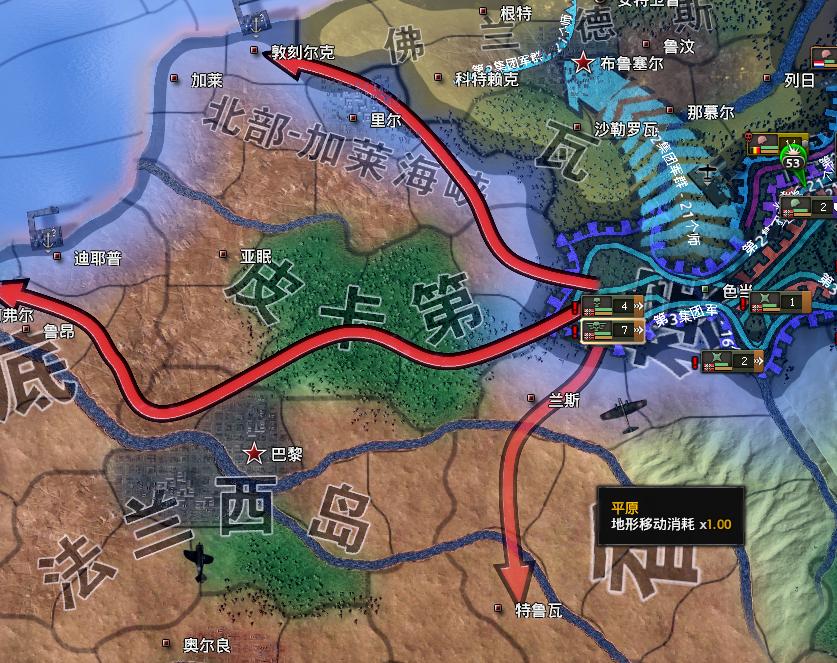 另外由于游戏中法国投降界限很低,所以我们可以优先解决法国,而不用考虑比荷军队,这与历史上的进攻路线是前后掉转的。最后,游戏中的英法联军并不像历史那样守在法国边境,所以比荷军队十分弱小,平推也是可以轻松打赢的。