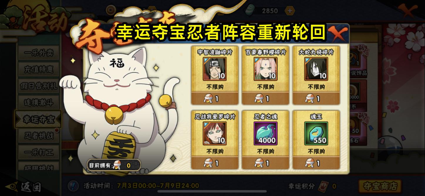 上次的幸运夺宝按照顺序本该下架照美冥上架半蛇兜,但当时半蛇兜还未从高级招募下架,所以官方临时用宇智波鼬来救场。而现在半蛇兜已经从高级招募下架,不知道这次上架幸运夺宝会有怎样的安排,因为下次幸运夺宝百豪樱应该要下架了,而取代她的忍者可能就是半蛇兜。如果还是按照宇智波鼬的顺序轮回的话,就轮到迪达拉了,现在迪达拉可以通过忍者许愿免费拿到,上架一个迪达拉是不是有点敷衍了?(个人猜测)