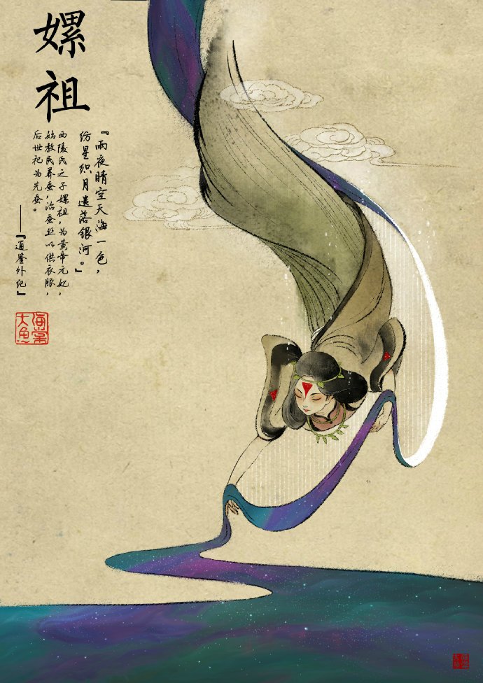 嫘祖,西陵氏之子嫘祖,为黄帝元妃,始教民养蚕,治蚕丝以供衣服,后世祀为先蚕。
