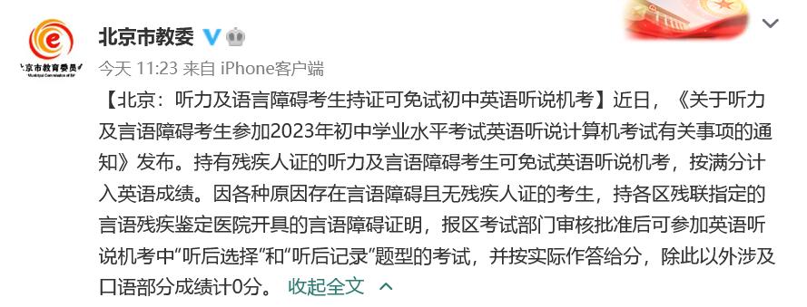 北京:听力及语言障碍考生持证可免试初中英语听说机考,按满分计入英语成绩