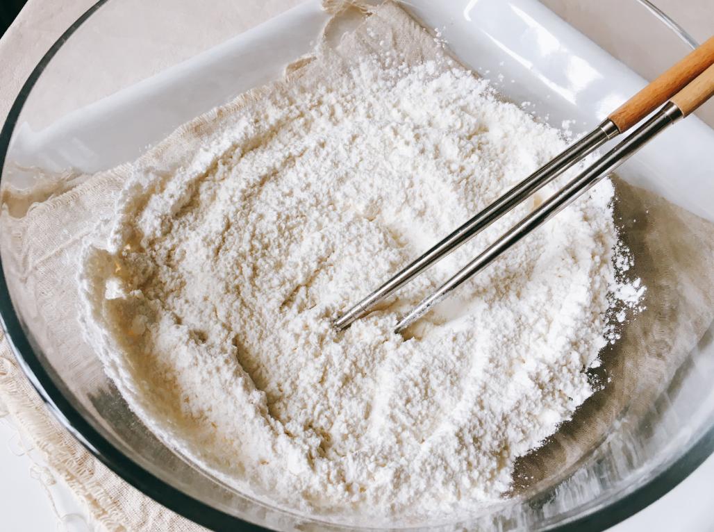 02.大碗中,混合面粉、糖和盐,拌匀备用。
