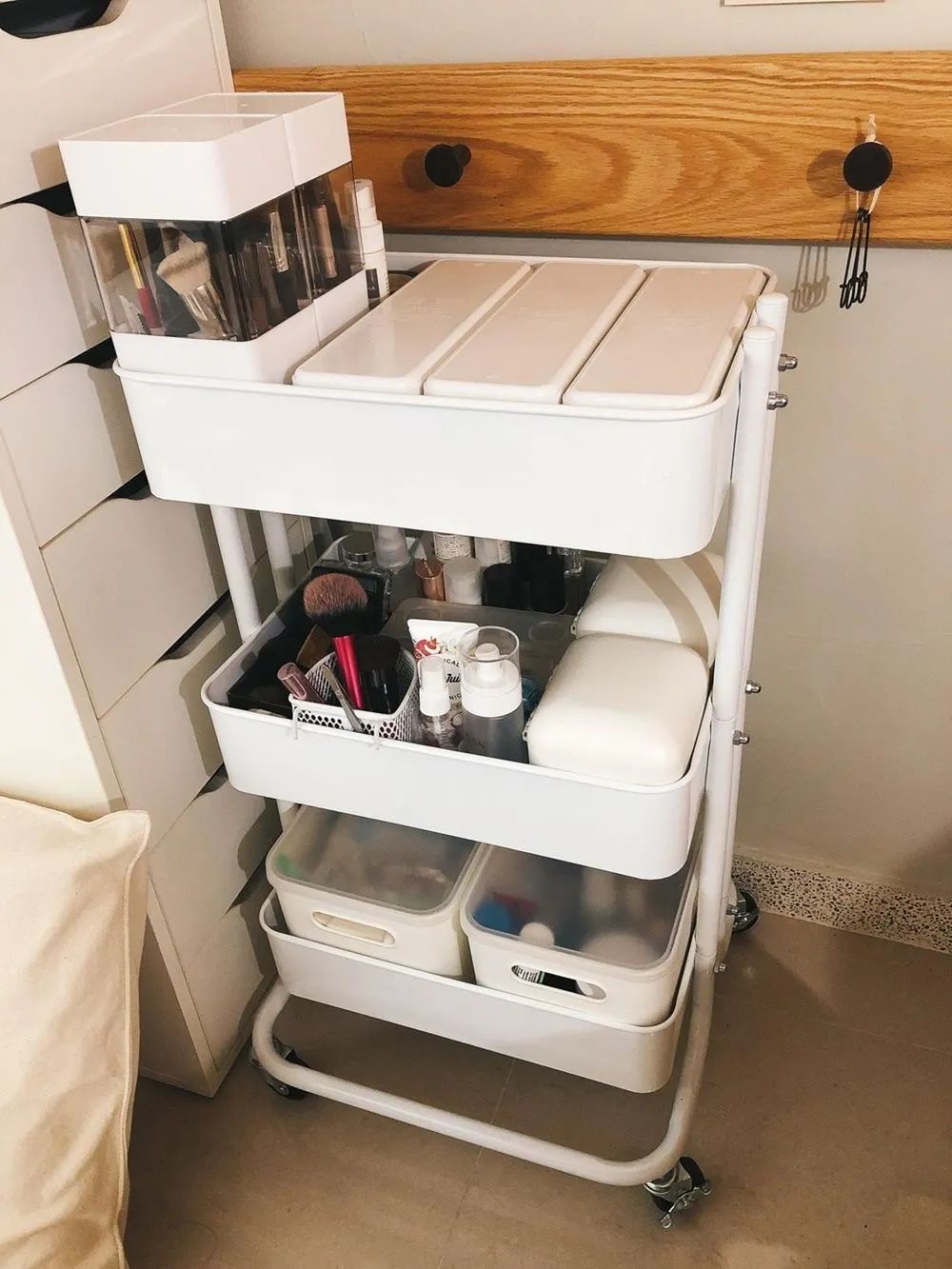3. 推⾞:IKEA 的绿⾊推⾞是当作缝纫机的推⾞,她拿来放各种上⾊⽤具;另⼀台⽩⾊推⾞不是 IKEA 的,主要是摆放美妆⽤品,上层的⼤创收纳盒强烈推荐给有很多气垫粉饼的女孩们,⽅形的盒身放得下眼影盘、打亮饼、腮红等,上下两层相迭还能有效防尘喔!