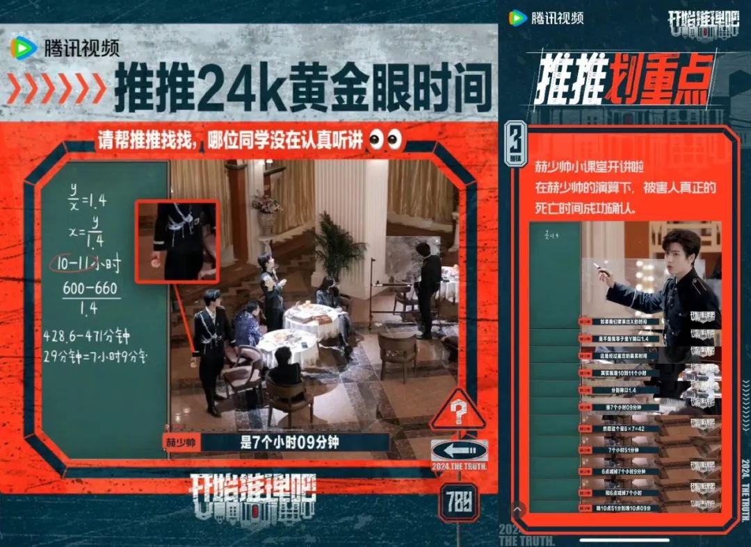 而张凌赫则是解题担当,数学题就是他的舒适区。节目组专门设置了有趣的“张凌赫小课堂”,让他来讲解计算、推理过程。比如第二期里,需要推理死亡时间,张凌赫迅速列出了计算的方程,给众人讲解时差如何计算,最终成功推导出真实的死亡时间。