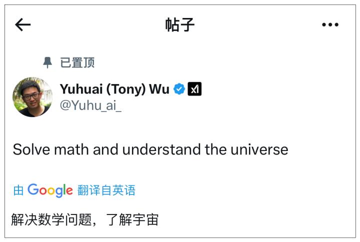 2023年7月,xAI成立,吴宇怀加入并担任联合创始人。他的海外社交账号,首页至今置顶着当天的一条内容:“解决数学问题,了解宇宙本质。”